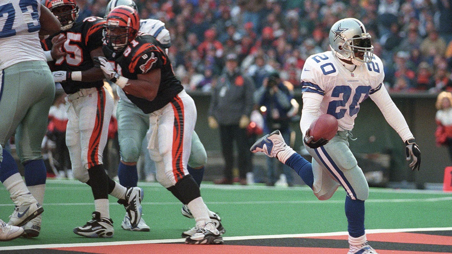 Dallas Cowboys, which runs back Sherman Williams (20) scores a touchdown against Cincinnati Bengals at Riverfront Stadium 14 December 1997. (Matthew Emmons/USA Today Sports)