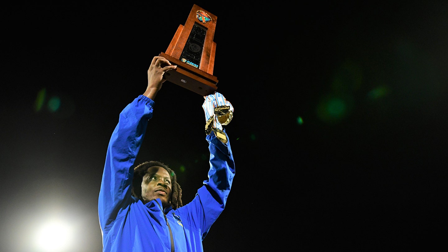 Miami Northwesterns Teddy Bridgewater raises the state trophy after the team’s win over Raines in Class 3A Championship on December 14, 2024. (Chet Peterman/Special to Post/USA Today -Network via Imag images)