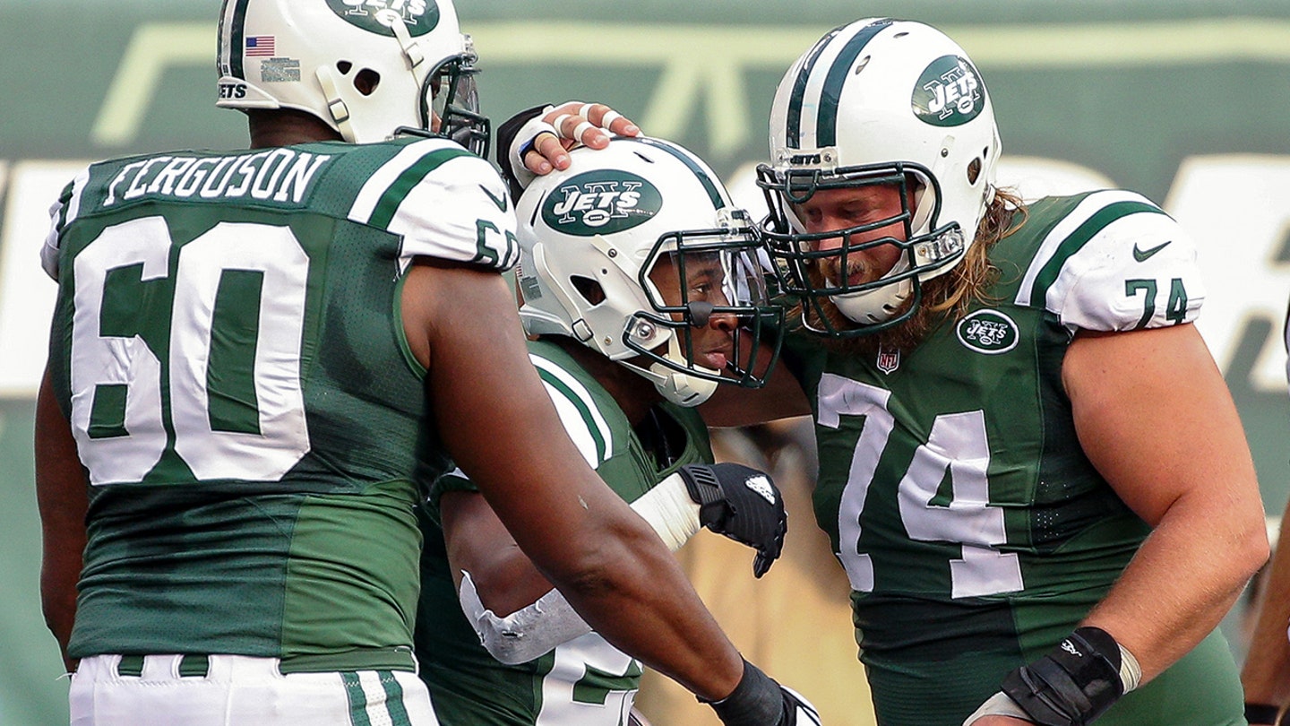 New York Jets Center Nick Mangold (74) congratulates driving Bilal Powell (29) after scoring a touchdown against the Tennessee Titans at Metlife Stadium on December 15, 2013. (Vincent Carchietta/USA Today Sports)
