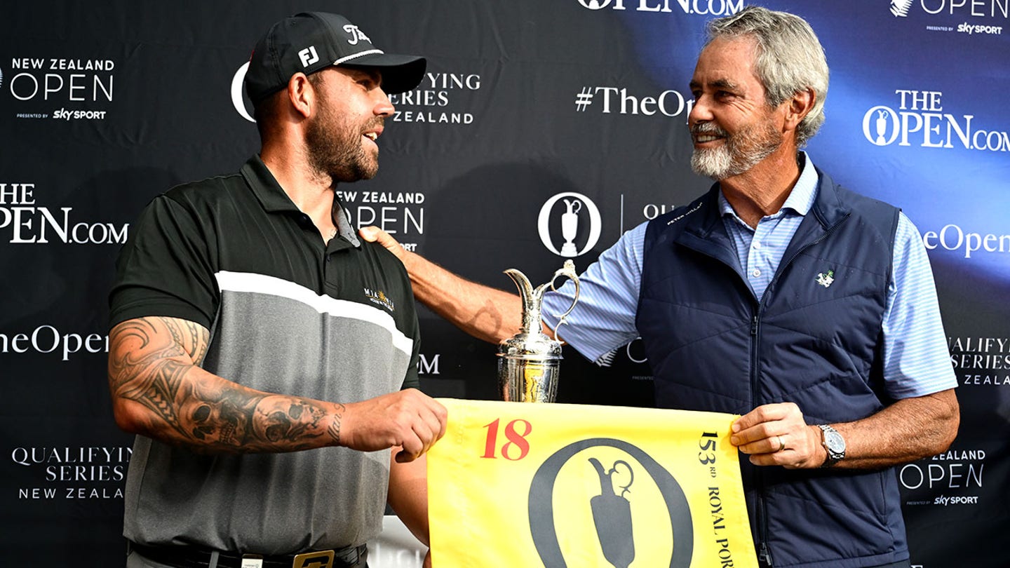 Former open championship winner Ian Baker-Finch congratulates Ryan Peake from Australia after winning the 2025 New Zealand Open qualified him for the next open championship at Millbrook Resort on March 2, 2025 in Queenstown, New Zealand. (Hannah Peters/Getty Images)
