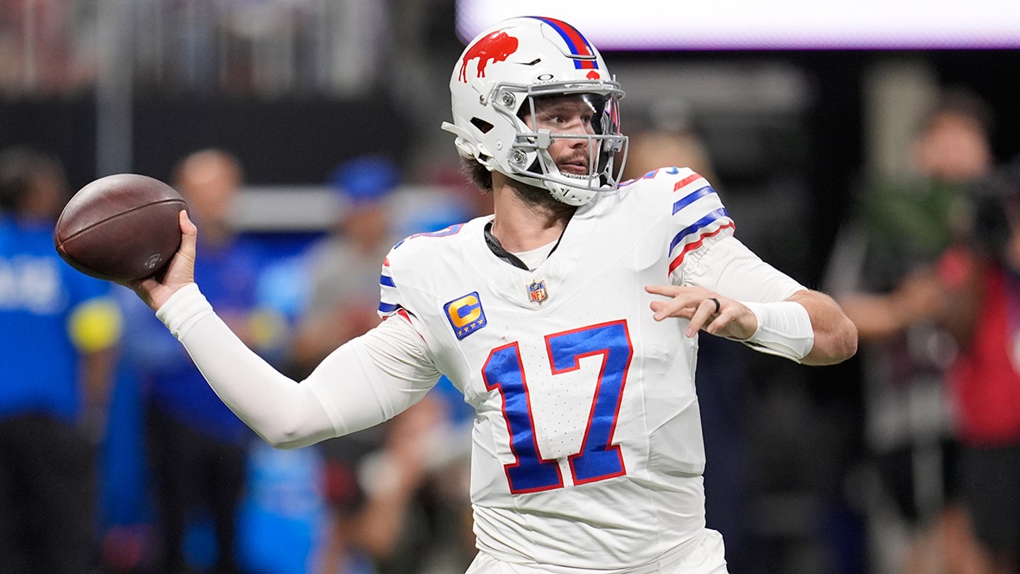 Buffalo Bills Quarterback Josh Allen (17) throws a passport during the first half of an NFL football match against Atlanta Falcons, Monday, October 13, 2025, in Atlanta. (AP Photo/Mike Stewart)