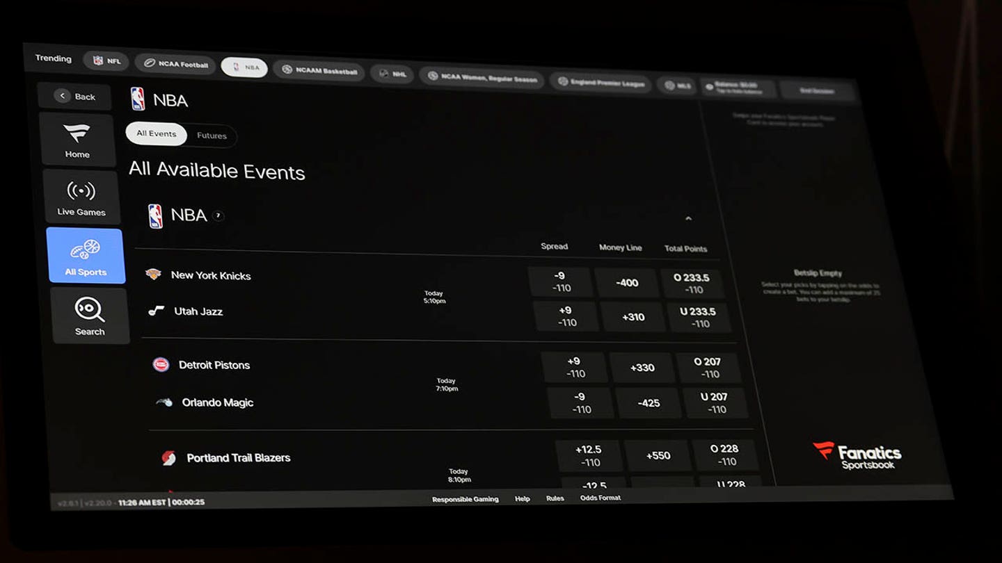 A self-service betting kiosk showing NBA game odds at Fanatics Sportsbook on November 23, 2024 in Columbus, Ohio. (Aaron M. Sprecher/Getty Images)