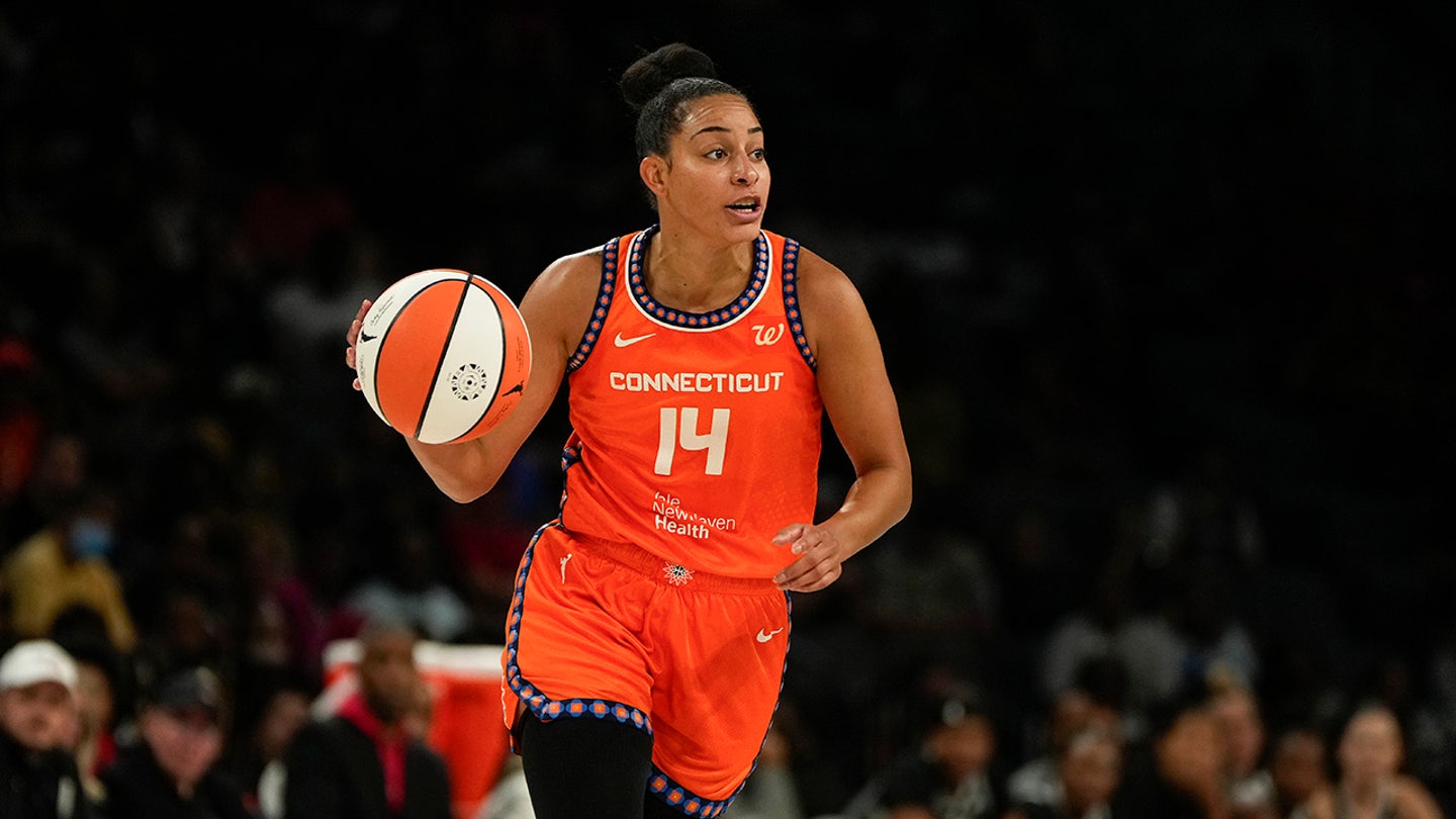 Connecticut Sun Guard Bria Hartley (14) dribbles the ball during the first half of a WNBA basketball match against Las Vegas Aces at Michelob Ultra Arena on August 10, 2025. (Lucas Peltier/ Imag images)