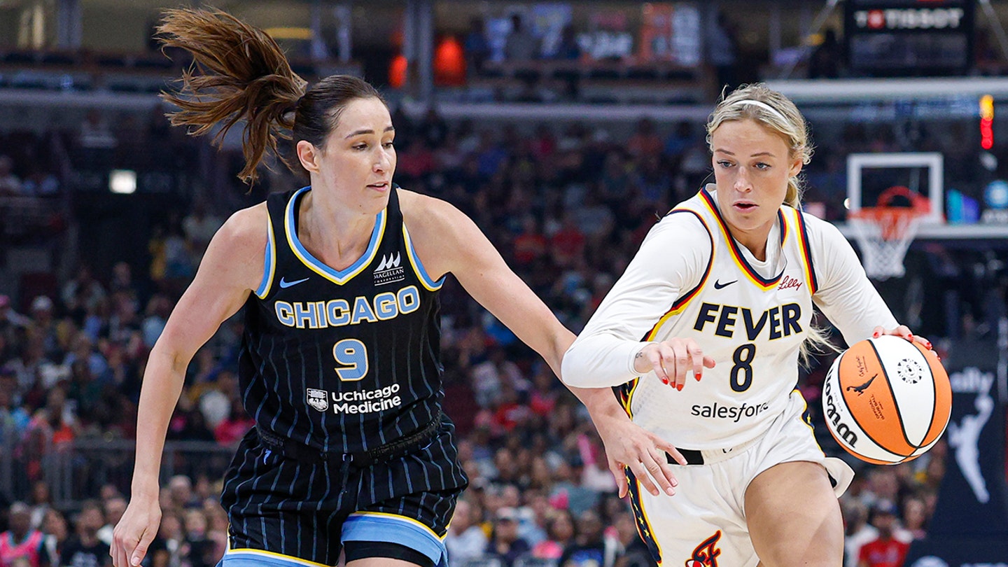 Indiana Fever -vagt Sophie Cunningham, #8, drives to the curve to Chicago Sky Guard Rebecca Allen, #9, during the first half of the United Center in Chicago on July 27, 2025. (Kamil Krzaczynski-IMAGN images)