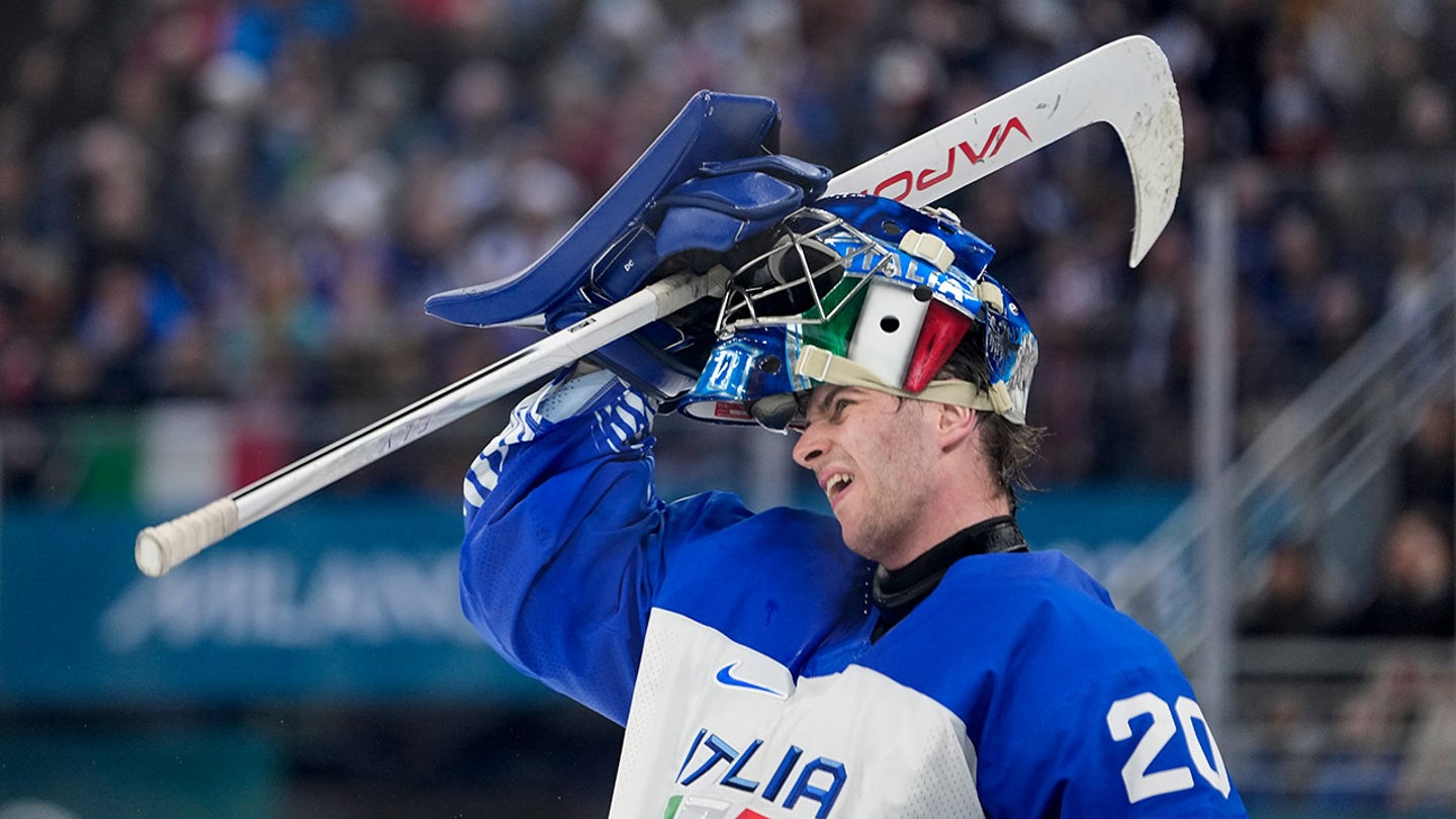 Italy’s goalkeeper Damian Clara adjusts his helmet during a men’s ice hockey preliminary round against Finland at the 2026 Winter Olympics in Milan, Italy, on February 14, 2026. (Hassan Ammar/AP Photo)