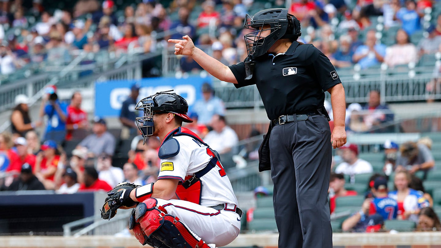 Umpire Jen Pawol movements to start the game between Miami Marlins and are bravening in Truist Park on August 10, 2025 in Atlanta. (Todd Kirkland/Getty Images)