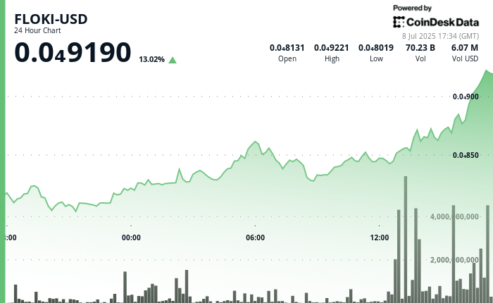 MEMECOIN FLOCKI ROCKETS 12.1% in a 24-hour session that bursts from $ 0.0000815 to $ 0.0000915 on solid volume, while the wider Coindesk 20 market index only achieved 1.4%.