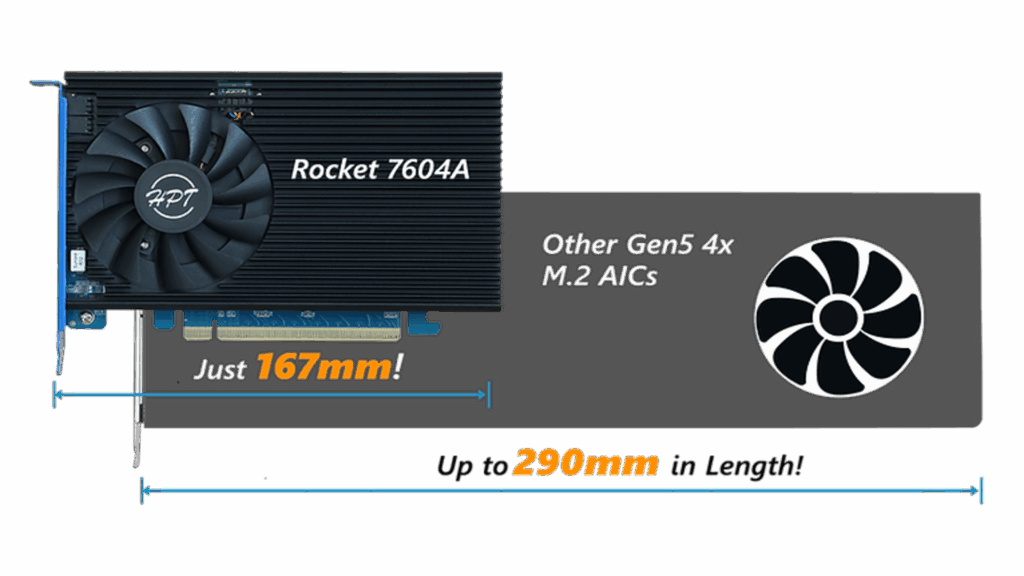 Physically, Rocket 7604A is compact and measures only 167 mm, shorter than other 4-port Gen5 card, which often reaches 290 mm or more.
