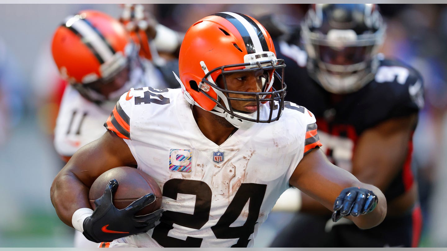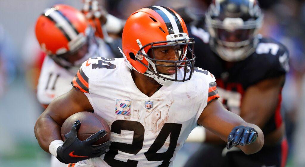 Nick Chubb, #24 of Cleveland Browns, runs with the ball in the fourth quarter against Atlanta Falcons at Mercedes-Benz Stadium on October 2, 2022 in Atlanta. (Todd Kirkland/Getty Images)