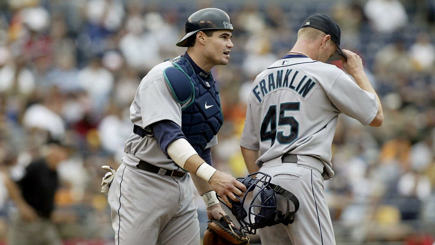 Seattle Mariners catcher Ben Davis (13) gives a slap to pitcher Ryan Franklin (45) during an interleague game against the San Diego Padres at Qualcomm Stadium in San Diego, California, June 22, 2003. The Padres won 3-1. (Todd Warshaw/Getty Images)