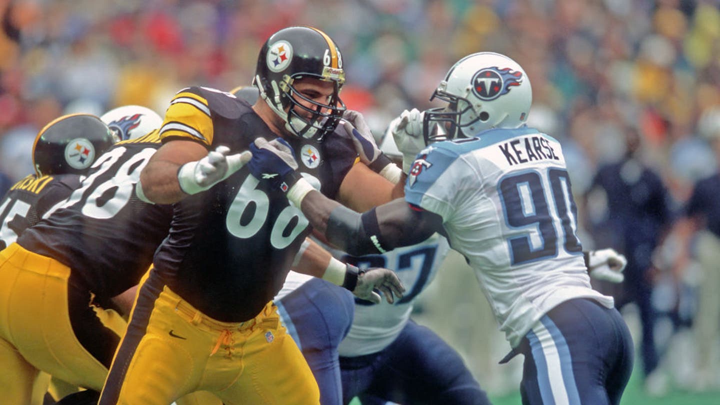 Pittsburgh Steelers offensive lineman Shar Pourdanesh (68) blocks against Tennessee Titans defensive lineman Jevon Kearse (90) during a game at Three Rivers Stadium on September 24, 2000 in Pittsburgh. The Titans defeated the Steelers 23-20. (Photo by George Gojkovich/Getty Images)