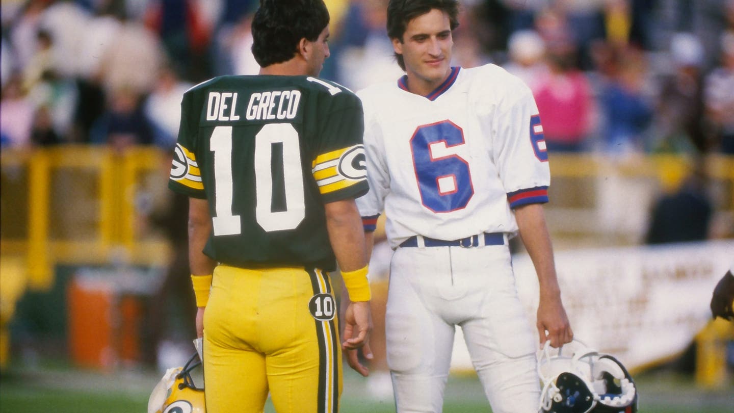 Green Bay Packers kicker Al Del Greco (10) talks with New York Giants kicker Ali Haji-Sheikh (6) on September 15, 1985 at Lambeau Field in Green Bay, Wisconsin. The Packers defeated the Giants 23-20.