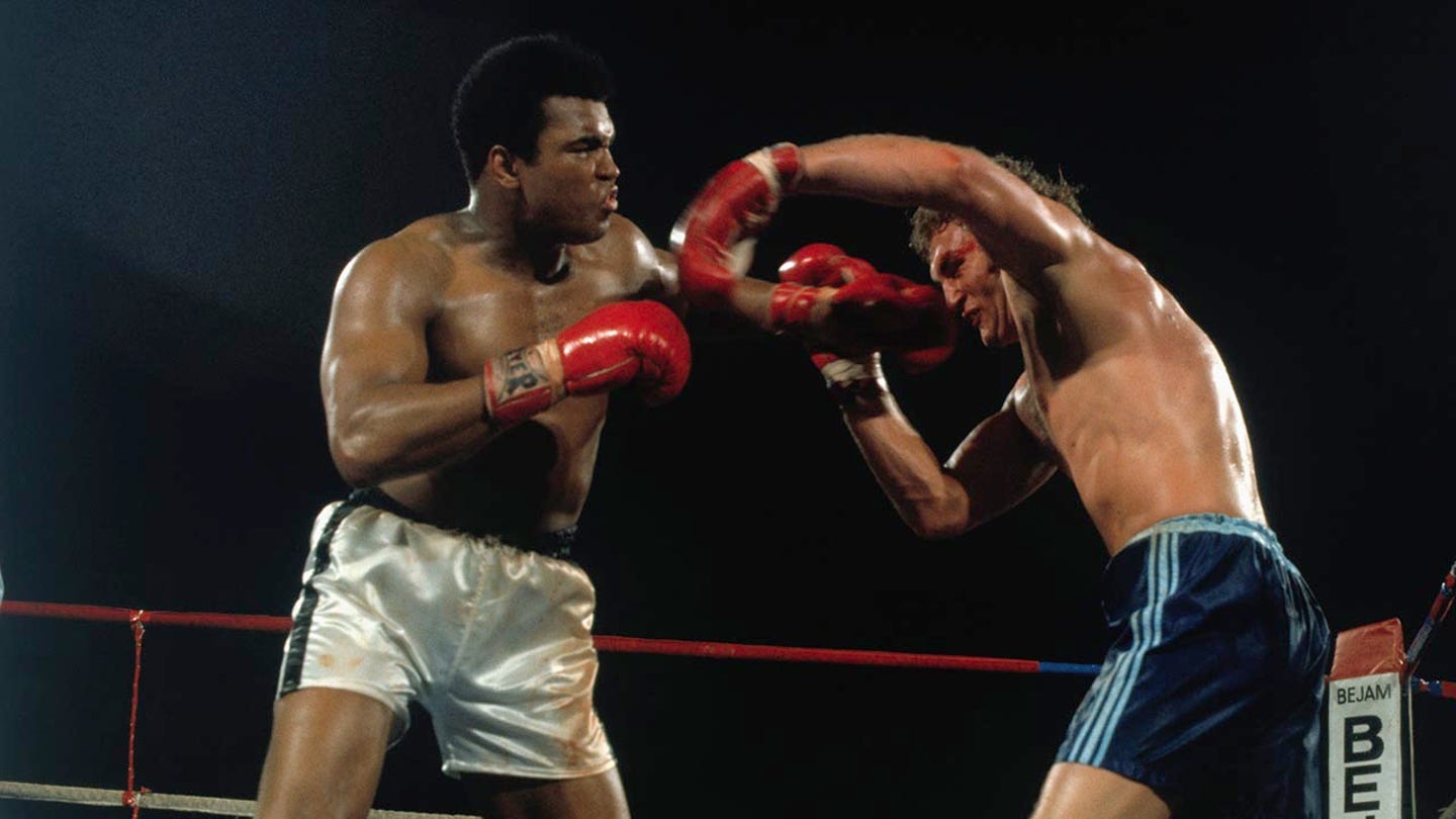 American boxer Muhammad Ali, left, and British boxer Joe Bugner during a fight in 1975. (Getty)