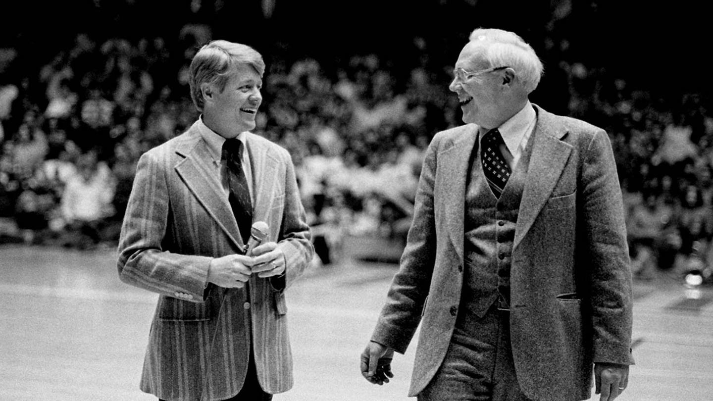 George MacIntyre, left, Vanderbilt’s new football coach, shares a moment with athletic director Roy Kramer after Kramer announced McIntyre’s hiring during halftime of Vanderbilt’s basketball game with the Citadel in Memorial Gym on Dec. 4, 1978. (Robert Johnson/The Tennessean)
