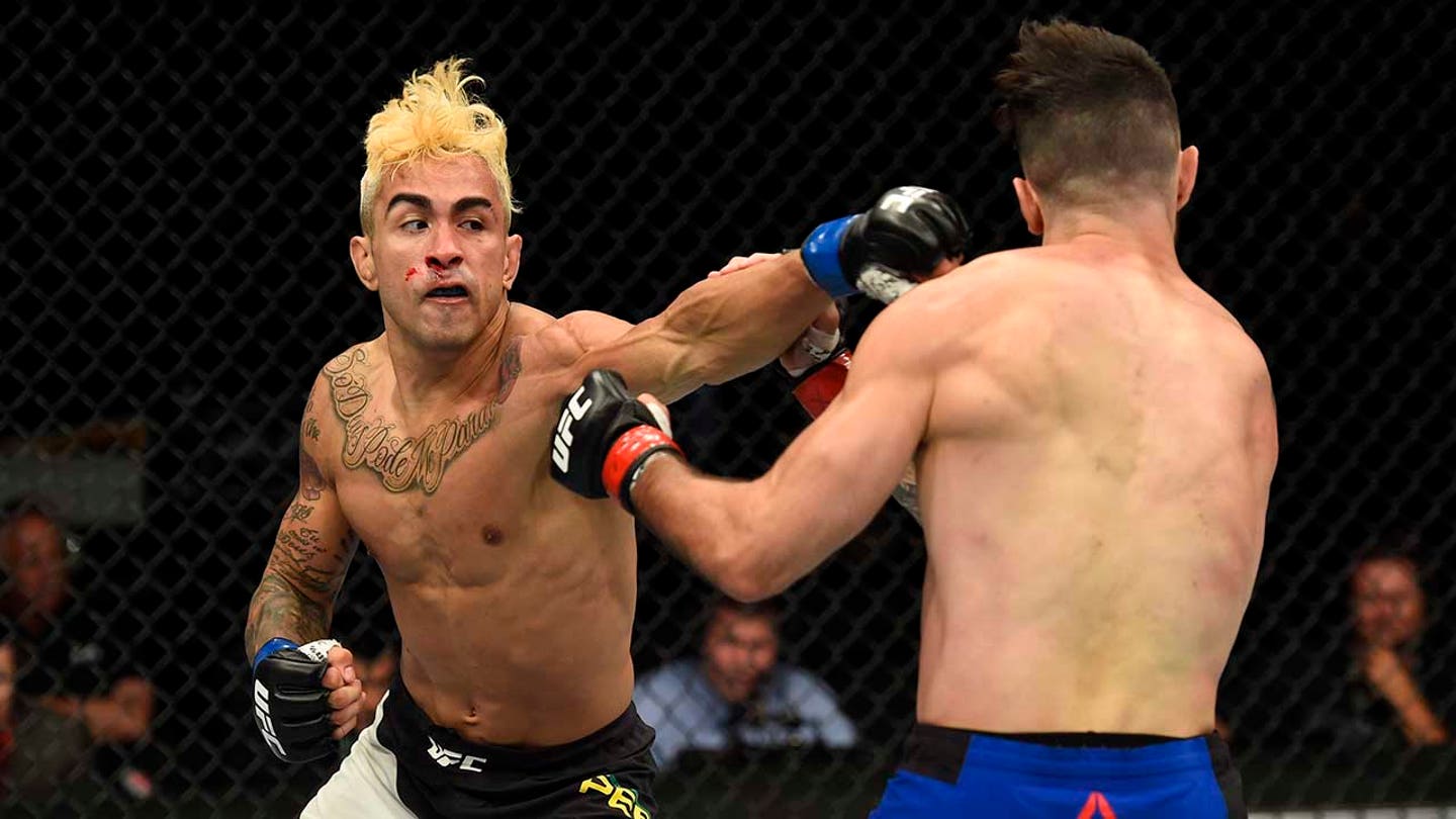(L-R) Godofredo Pepey of Brazil beats Shane Burgos in their featherweight bout during the UFC Fight Night event at the Nassau Veterans Memorial Coliseum in Uniondale, New York on July 22, 2017. (Josh Hedges/Zuffa LLC/Zuffa LLC via Getty Images)