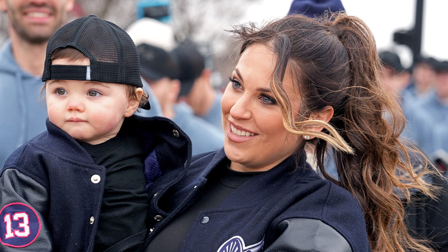 Meredith Gaudreau holds her daughter, Noah, during a commemorative ceremony for her husband, former Columbus Blue Jackets player Johnny Gaudreau and his brother Matthew, before the start of the game between Columbus Blue Jackets and Florida Panthers in the Nationwide Arena on October 15, 2024 in Columbus, Ohio. Gaudreau and his brother Matthew were killed when they were hit by a suspected drunk driver on August 29, 2024. (Kirk Irwin/NHLI via Getty Images)