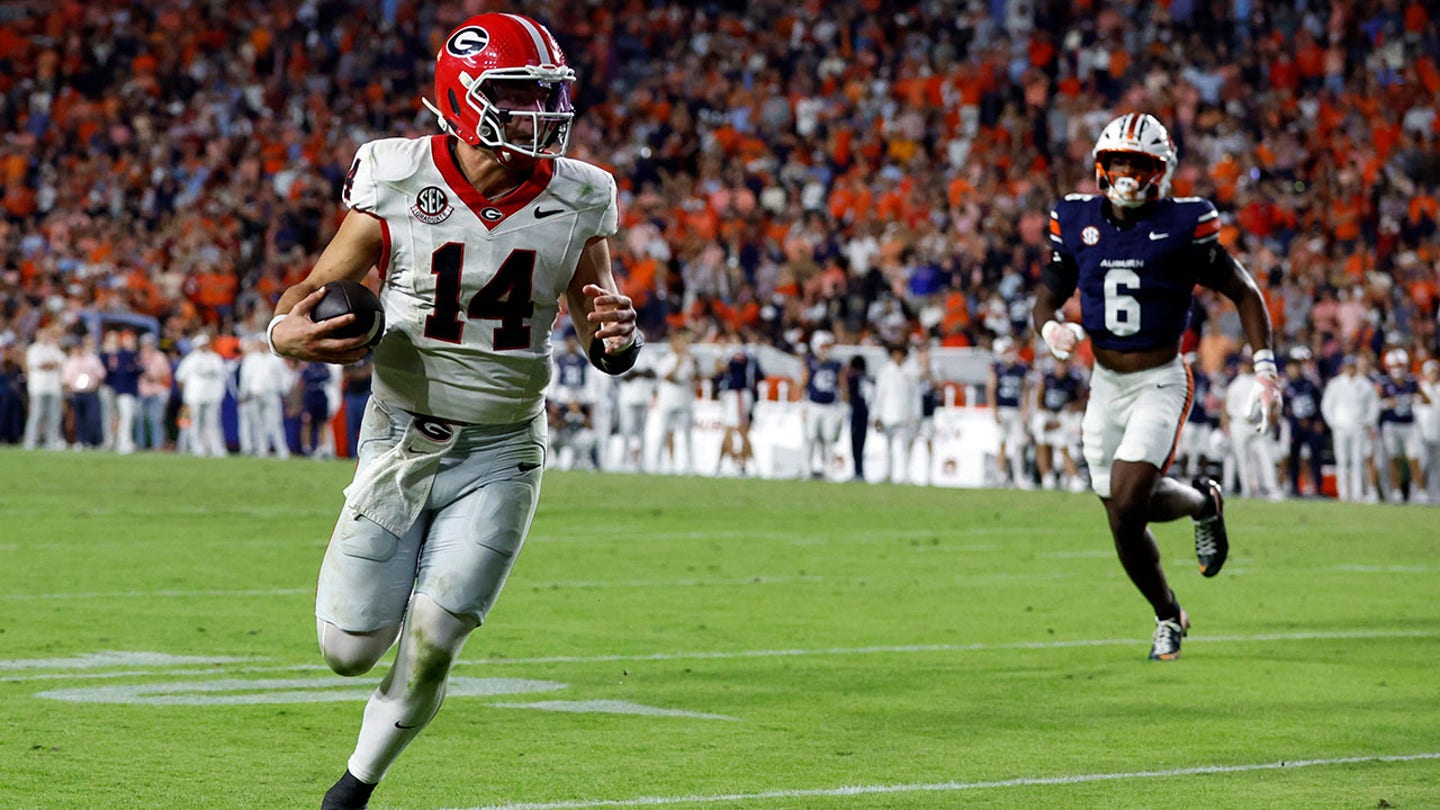 Georgia Quarterback Gunner Stockton (14) carries the ball to a touchdown against Auburn in the second half of a NCAA College -Football match, Saturday, October 11, 2025, in Auburn, Alabama. (AP Photo/Butch Dill)