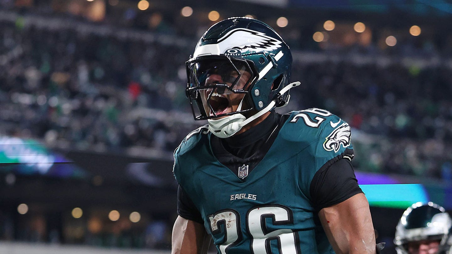 Philadelphia Eagles, who runs back Saquon Barkley (26) celebrates after a touchdown against the Washington commanders during the second half of the NFC Championship Game at Lincoln Financial Field. (Bill Streicher-Preferred Pictures)