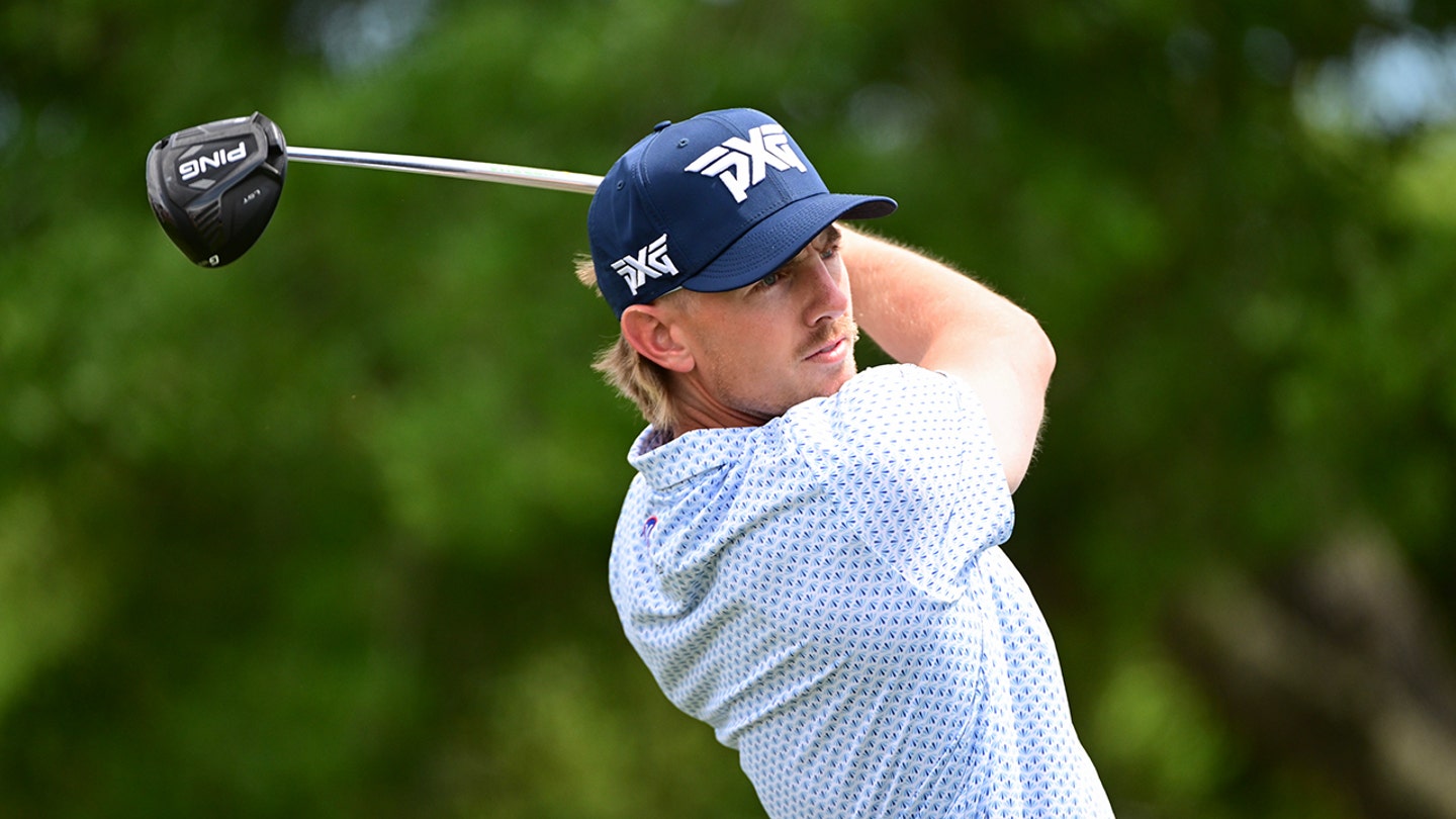 Jake Knapp from the United States hits a tee shot on the first hole during the second round of Texas Children’s Houston Open at Memorial Park Golf Course on March 29, 2024 in Houston. (Logan Riely/Getty Images)