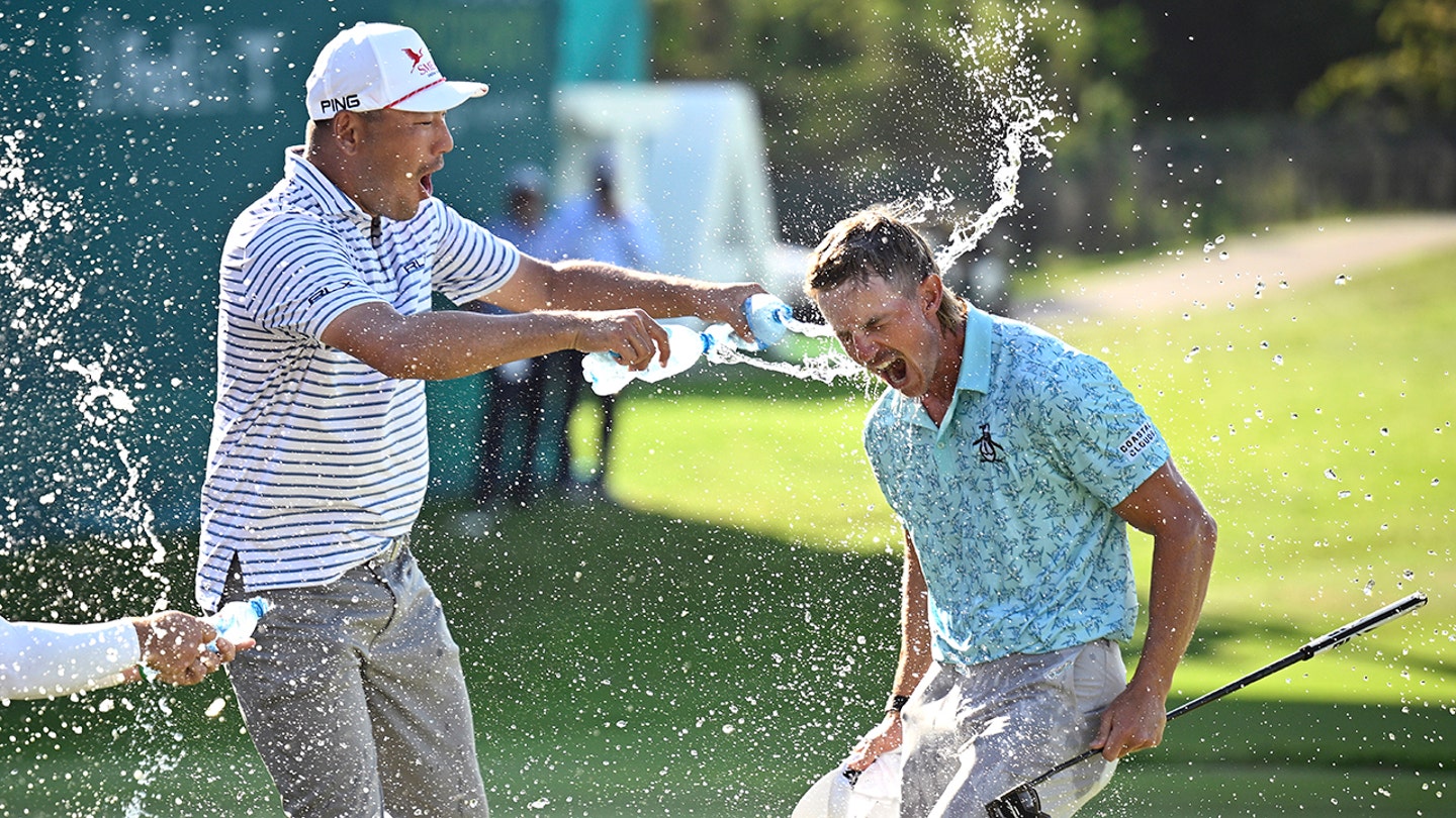 Jake Knapp from the United States celebrates the 18th green after winning the Mexico Open at Vidanta Vallarta on February 25, 2024 in Puerto Vallarta, Mexico. (Orlando Ramirez/Getty Images)
