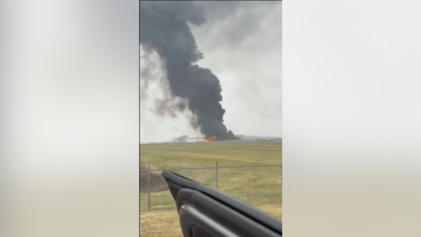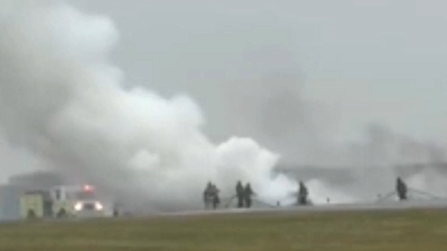 Video from the scene showed first responders rushing onto the runway as flames burned near the scattered wreckage of the plane.