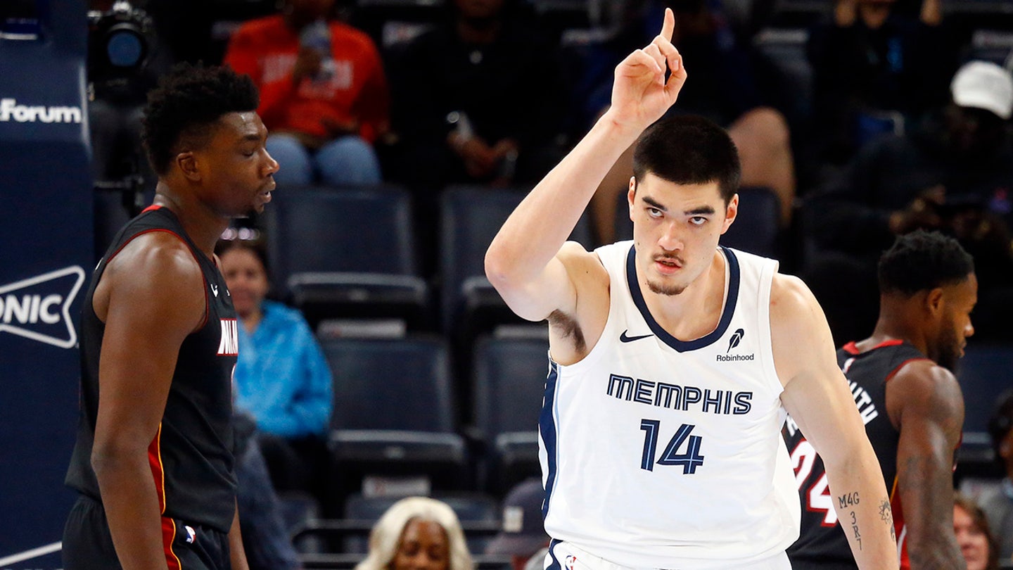 Memphis Grizzlies Center Zach Edey (14) responds after a jerk during the first half against Miami Heat at FedEx Forum. (Petre Thomas-Preferred Pictures)