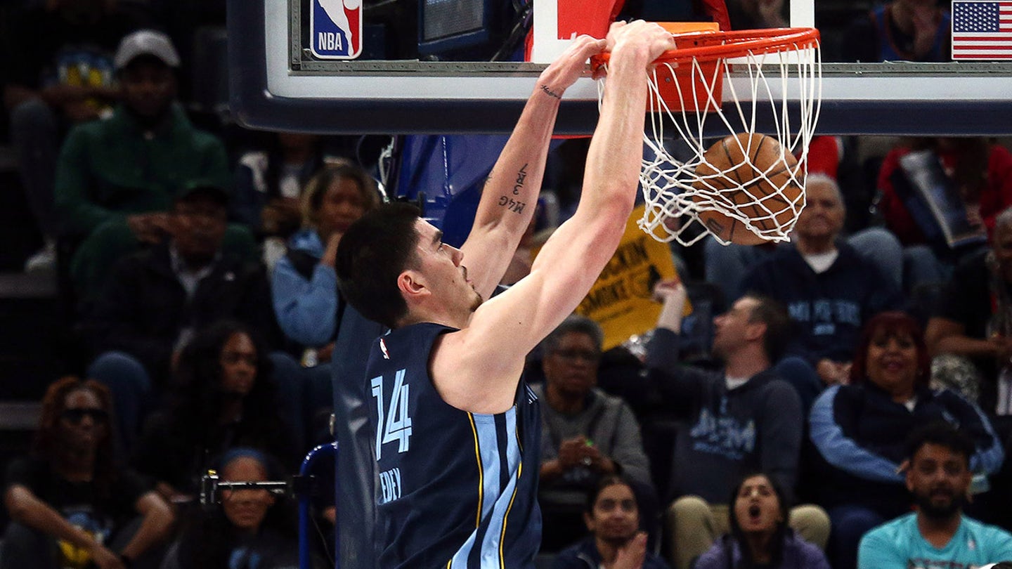 Memphis Grizzlies Center Zach Edey (14) Dunks during the first quarter against Oklahoma City Thunder at FedEx Forum. (Petre Thomas-Preferred Pictures)