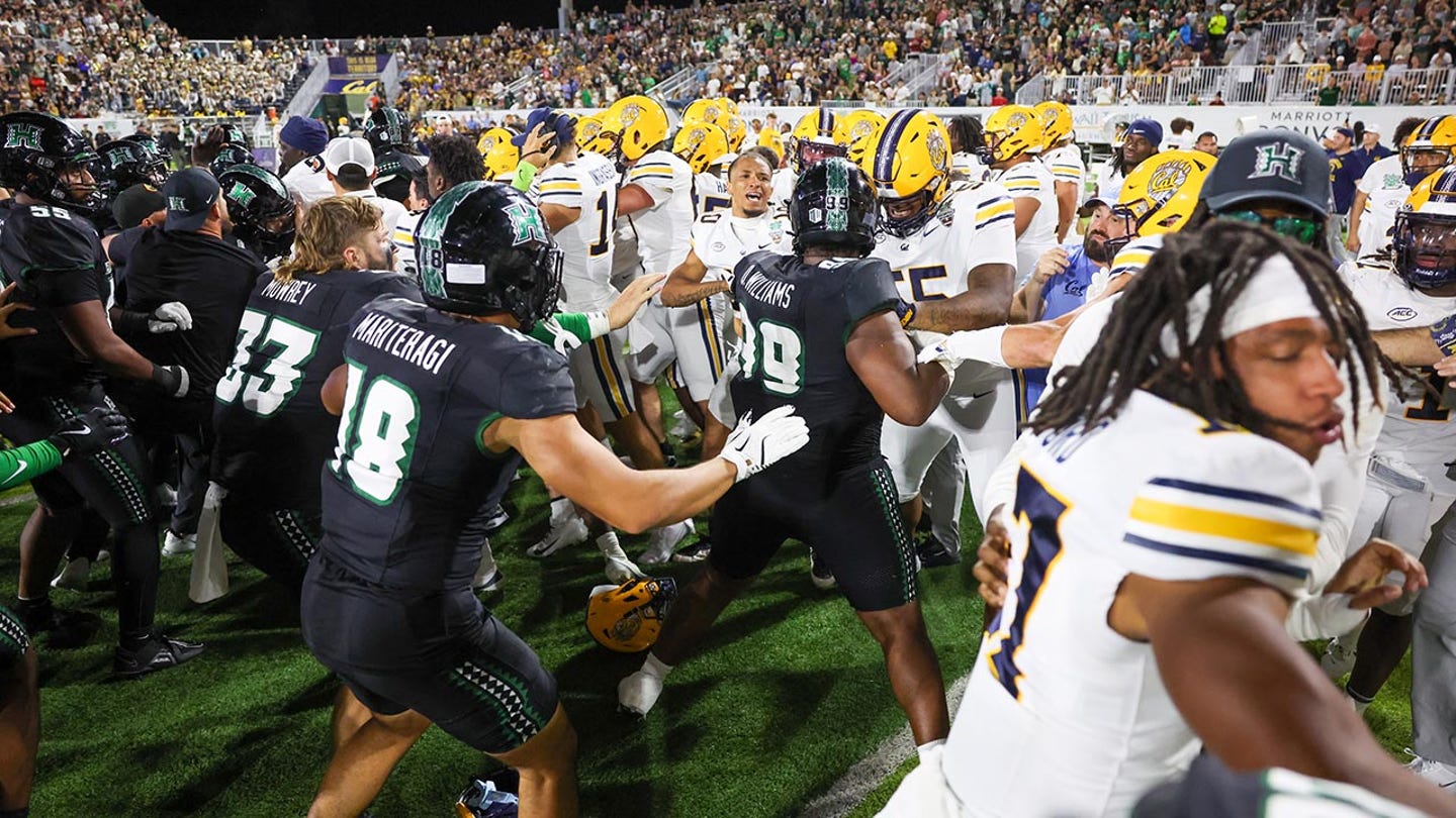 Behind the surge, California’s QuaRon Adams and Hawaii’s Brandon White started to mix it up. A fight ensued as Hawaii players and coaches rushed the field to celebrate the victory. It took a few minutes for the brouhaha to end.