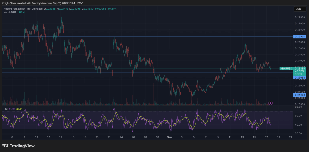 HBAR spent large parts of the last 23 hours at a narrow range and swung between $ 0.23 and $ 0.24 in what made up only 2% volatility. Token stirred short session heights of $ 0.24 on September 16 around 18:00 UTC before slipping lower, and eventually found repeated support near $ 0.23. Several rebound trials from this level through September 17, breakfast trade hinted at a potential price floor, although the conviction remained limited.