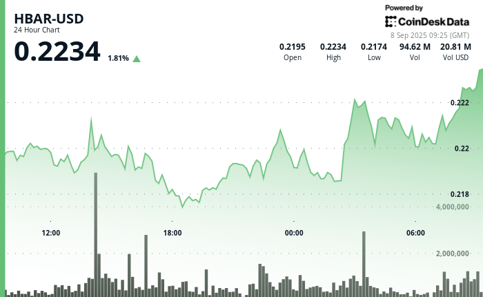 Hedera’s Har-Token released stable winnings in a 23-hour trading stretch from September 7 at. 09:00 to 8 September at. Price action reflected only 2% volatility between key $ 0.22 support and resistance levels, emphasizing a period of relative stability for the company -focused digital asset.