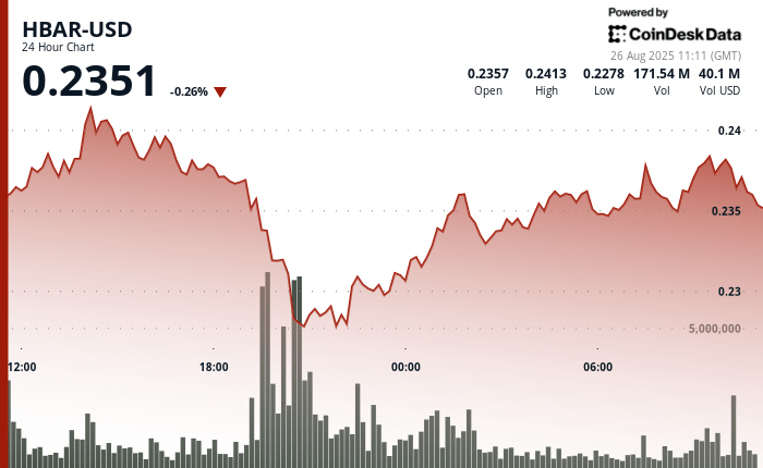 Hedera’s Hbar -Token so sharp swings in the past trade session, with award that reflects both strong sales pressure and signs of institutional support. During the 23-hour window from August 25 at 1 p.m. 11am to 26 August at. 10am traded HBAR in a $ 0.014 interval between $ 0.242 and $ 0.228, corresponding to a 5.83% intraday. The most notable volatility came in 19: 00-20: 00 hour on August 25, when the token fell from $ 0.237 to $ 0.228 in a steep sale.