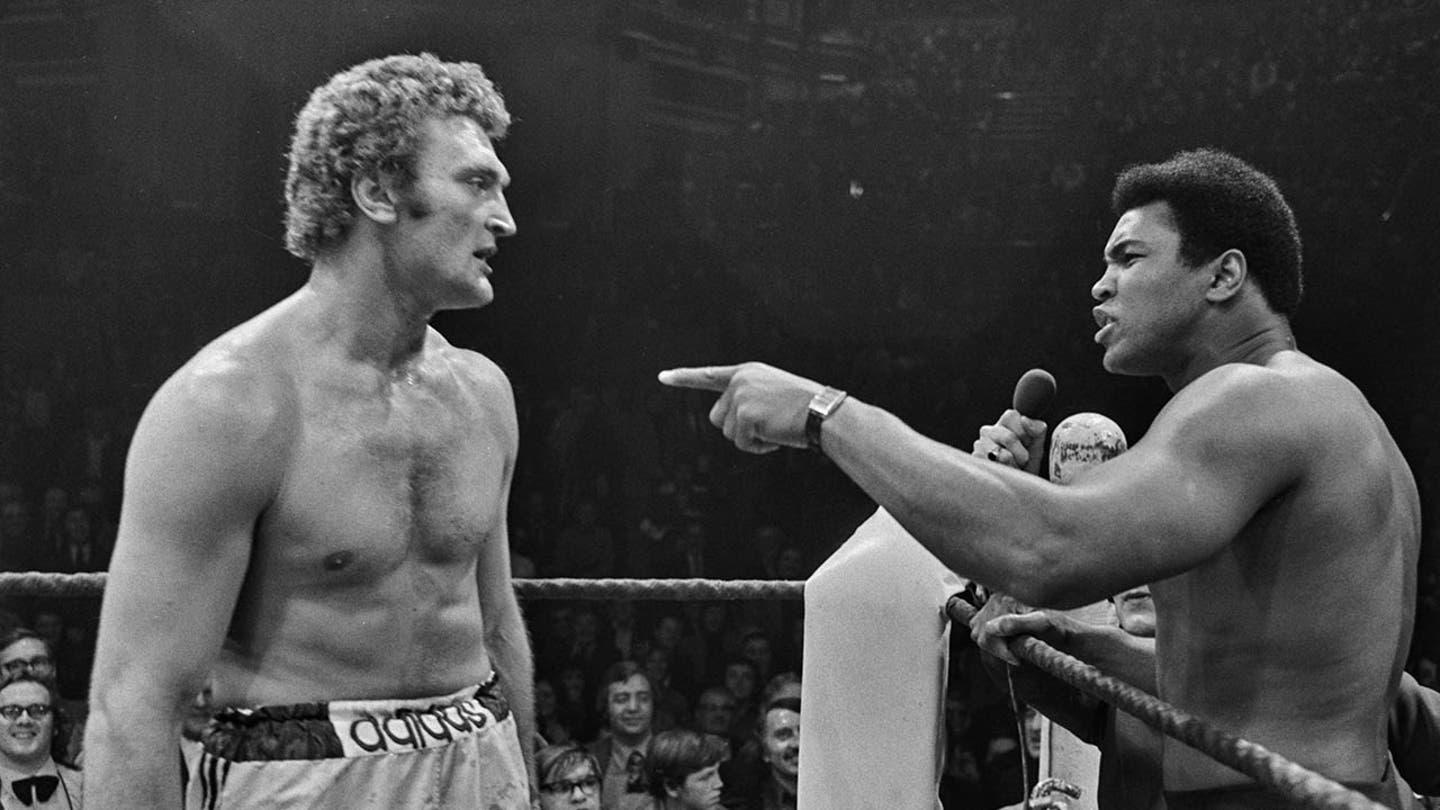 American boxer Muhammad Ali (L) and British boxer Joe Beeping Fighting in a Battle. Ali won the 12 round match in 1975. (Getty)