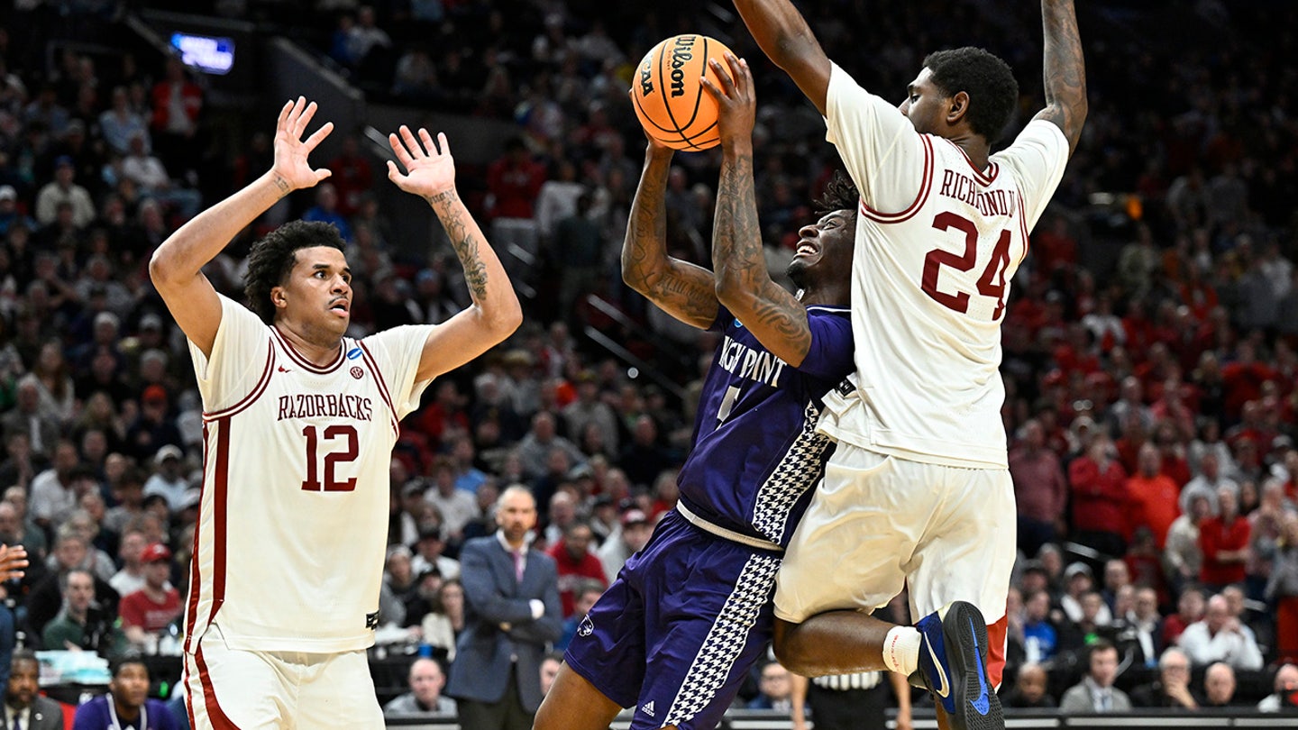 High Point Panthers forward Terry Anderson (5) drives against Arkansas Razorbacks forward Malique Ewin (12) and forward Billy Richmond III (24) in the second half during a second round men’s 2026 NCAA Tournament game at the Moda Center. (Craig Strobeck/Imagn Images)