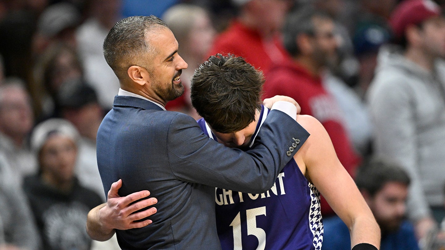 High Point Panthers head coach Flynn Clayman and forward Braden Hausen (15) react in the second half against the Arkansas Razorbacks during a second round of the men’s 2026 NCAA Tournament at the Moda Center. (Craig Strobeck/Imagn Images)