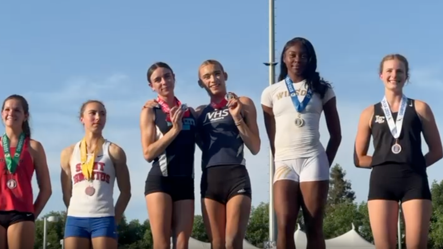 AB Hernandez shares the long jump runner-up medal stand with a female competitor at the California State Track and Field Championships. (Courtesy of Beth Bourne)