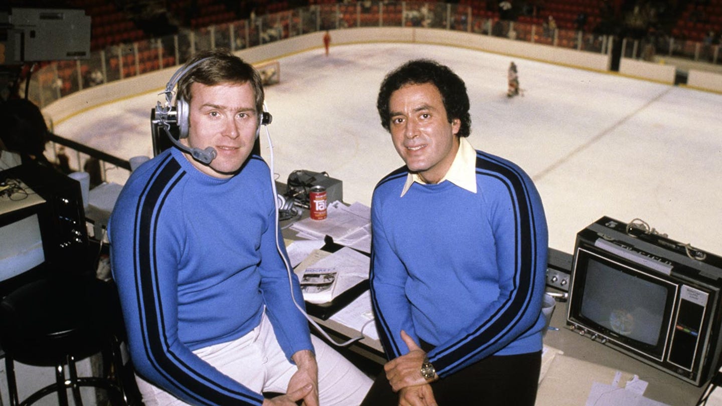 The retired NHL goalkeeper Ken Dryden sits with ABC Sports commentator Al Michaels under the Swedish -associated states Men’s Hockey Games at Winter -Ol in 1980 in Lake Placid, New York. (Steve Fenn/Getty Images)