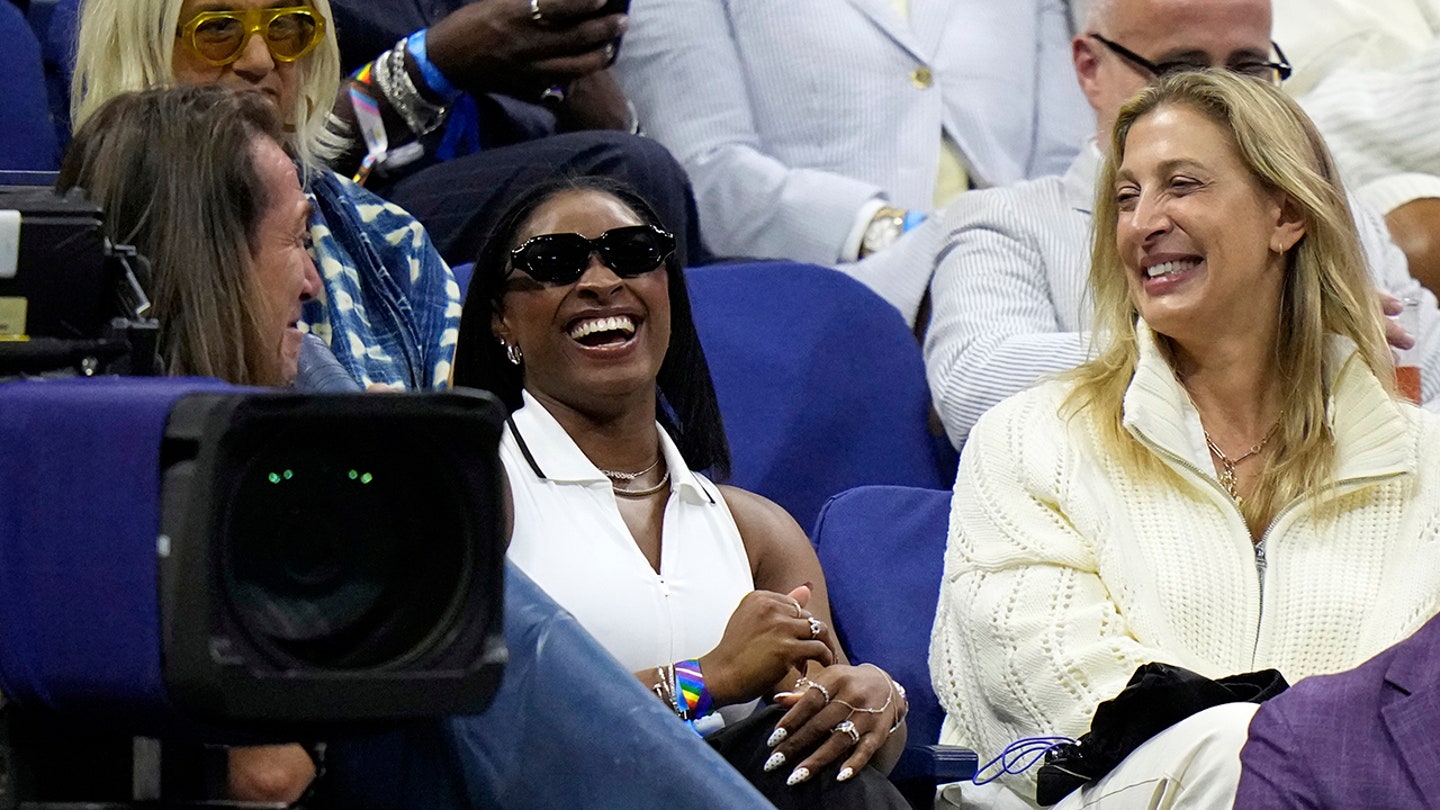 Gymnast Simone Biles, Center, responds to Coco Gauff, the United States, mentioned her after Gauff’s match against Donna Vekic from Croatia, during the second round of the US Open Tennis Championships, August 28, 2025, in New York. (AP Photo/Frank Franklin II)