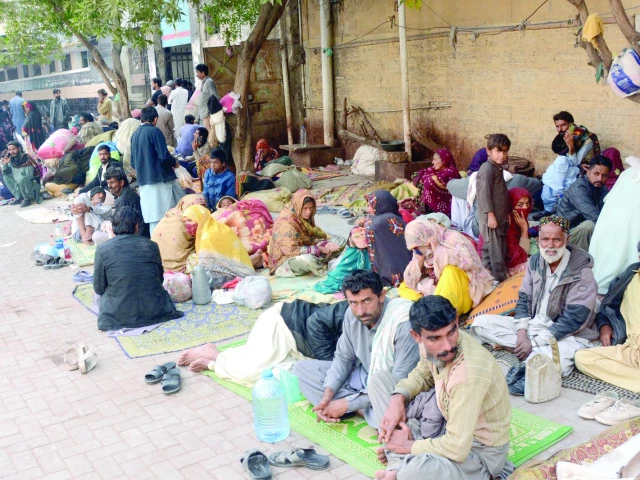 Hosts of out-of-town patients camp in an open space at the Civil Hospital due to lack of free shelter. Photo: Jalal Qureshi/Express