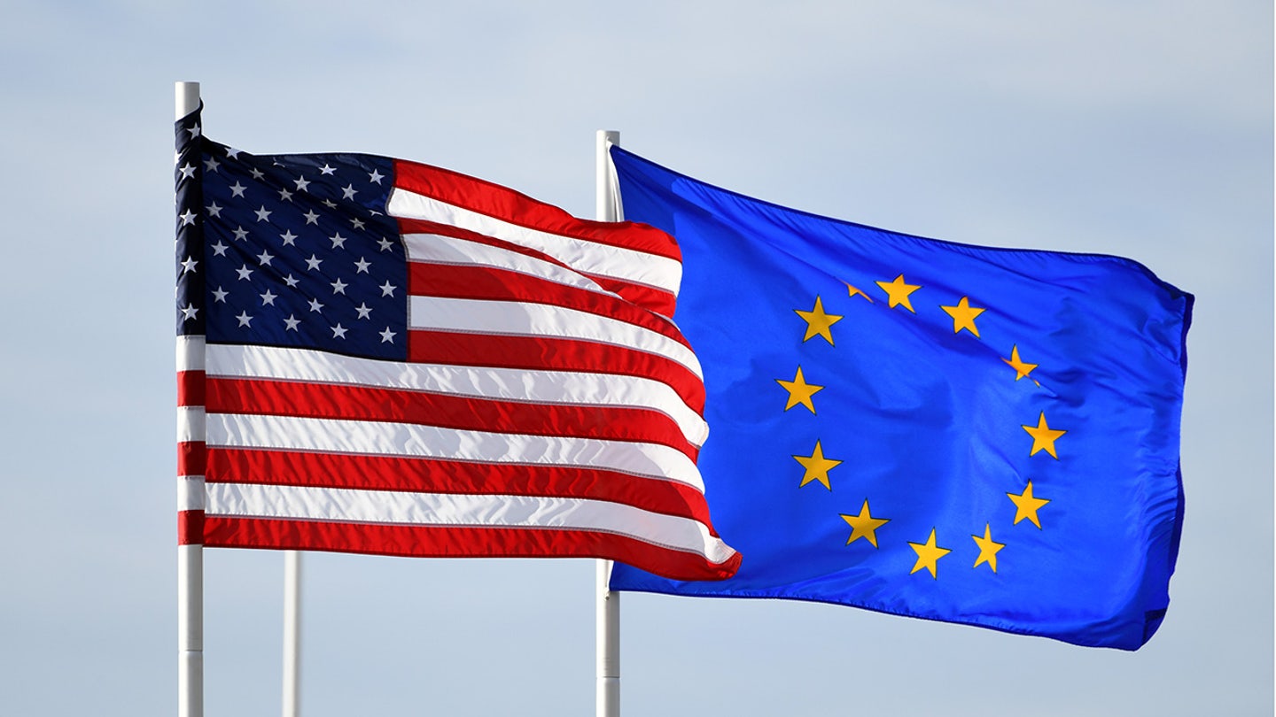 General view of the US and European flags during the day two of the 43rd Ryder Cup in Whistling Straits, Wisconsin. (Anthony Behar/PA images via Getty Images)