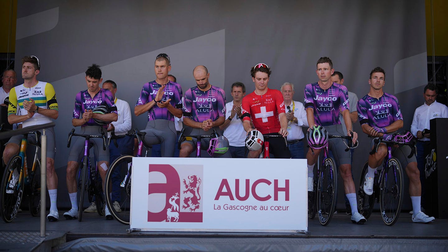 Team Jayco Alula takes care of the death of Italian cyclist Samuele Privitera before the start of the twelfth phase of the Tour de France in Hautacam, France, Thursday 17 July 2025. (AP Photo/Thibault Camus)