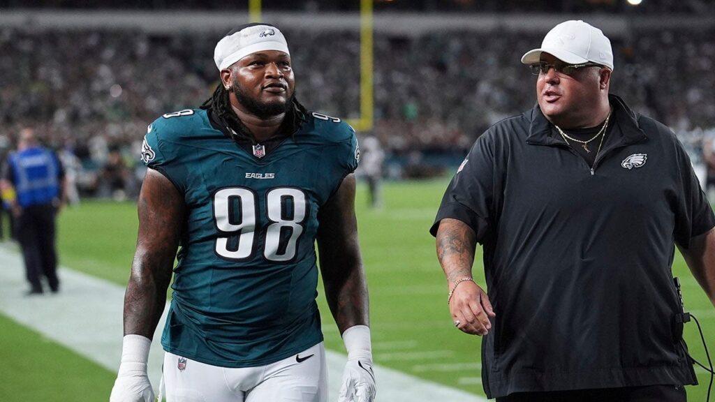 The Philadelphia Eagles Defensive Tackle Jalen Carter (98) goes off the field after being postponed during the first quarter of the game against Dallas Cowboys at Lincoln Financial Field on September 4, 2025. (Bill Streicher/Imag photos)