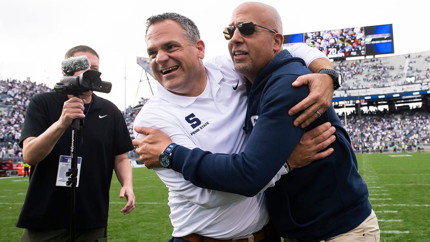 Penn State athletic director Pat Kraft gives football coach James Franklin a big hug after a 33-24 win over Indiana at Beaver Stadium on Saturday, Oct. 28, 2023, in State College, Penn. (IMAGIN)