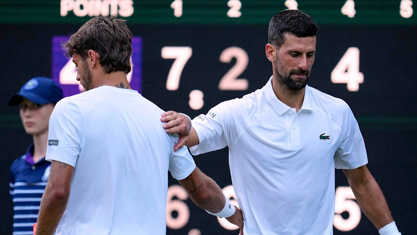 Flavio Cobolli, Left, controls Novak Djokovic after he slipped and fell during a quarter -final match in Wimbledon, Wednesday, July 9, 2025. (AP Photo/Kin Cheung)