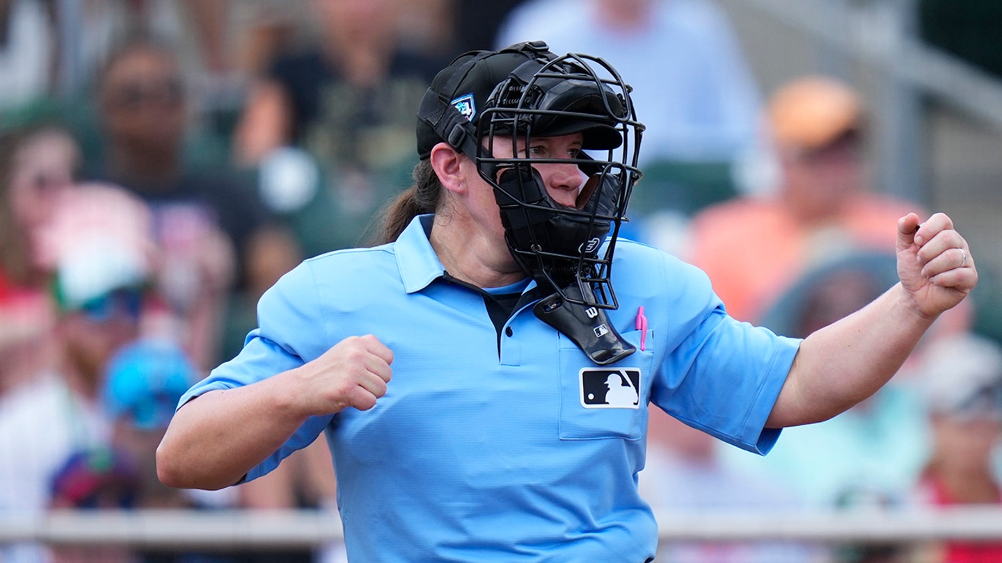 Umpire Jen Pawol calls a strike during a spring training game between Philadelphia Phillies and Miami Marlins at Roger Dean Stadium on March 16, 2024 in Jupiter, Florida. (Rich Storry/Getty Images)