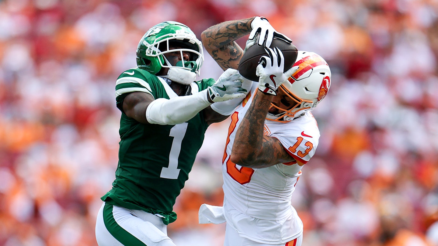 Tampa Bay Buccaneers Wide Receiver Mike Evans (13) catches a passport defense of the New York Jets Cornerback Sauce Gardner (1) in the third quarter at Raymond James Stadium in Tampa, Florida, on September 21, 2025. (Nathan Ray Seebeck/Imag- Pictures)