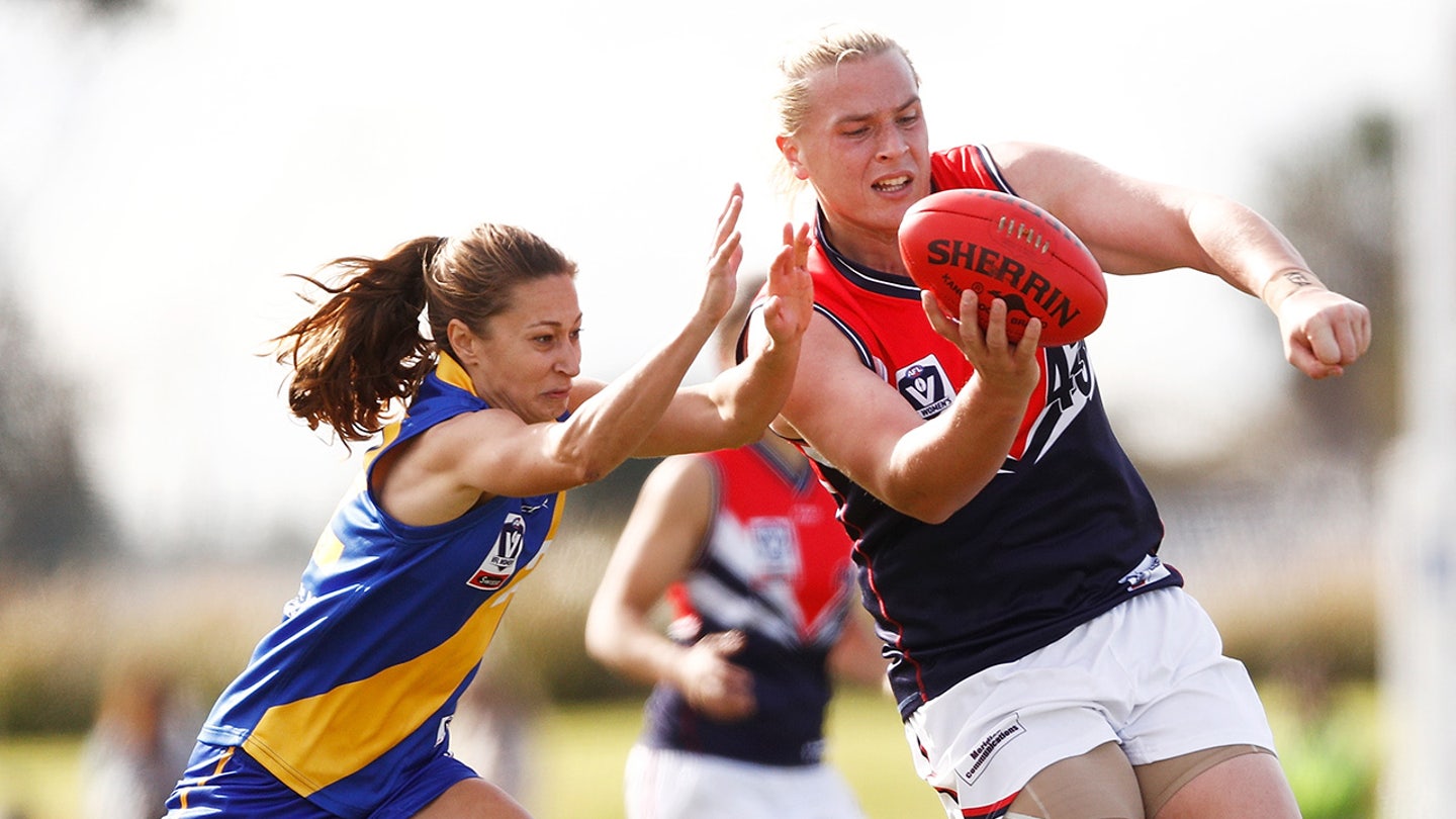 Hannah Mouncey from Darebin Handpasses the ball under the Round 8 VFLW match between Williamstown and Darebin at Williamstown Football Ground on July 1, 2018 in Melbourne, Australia. (Daniel Pocketett/AFL Media/Getty Images)
