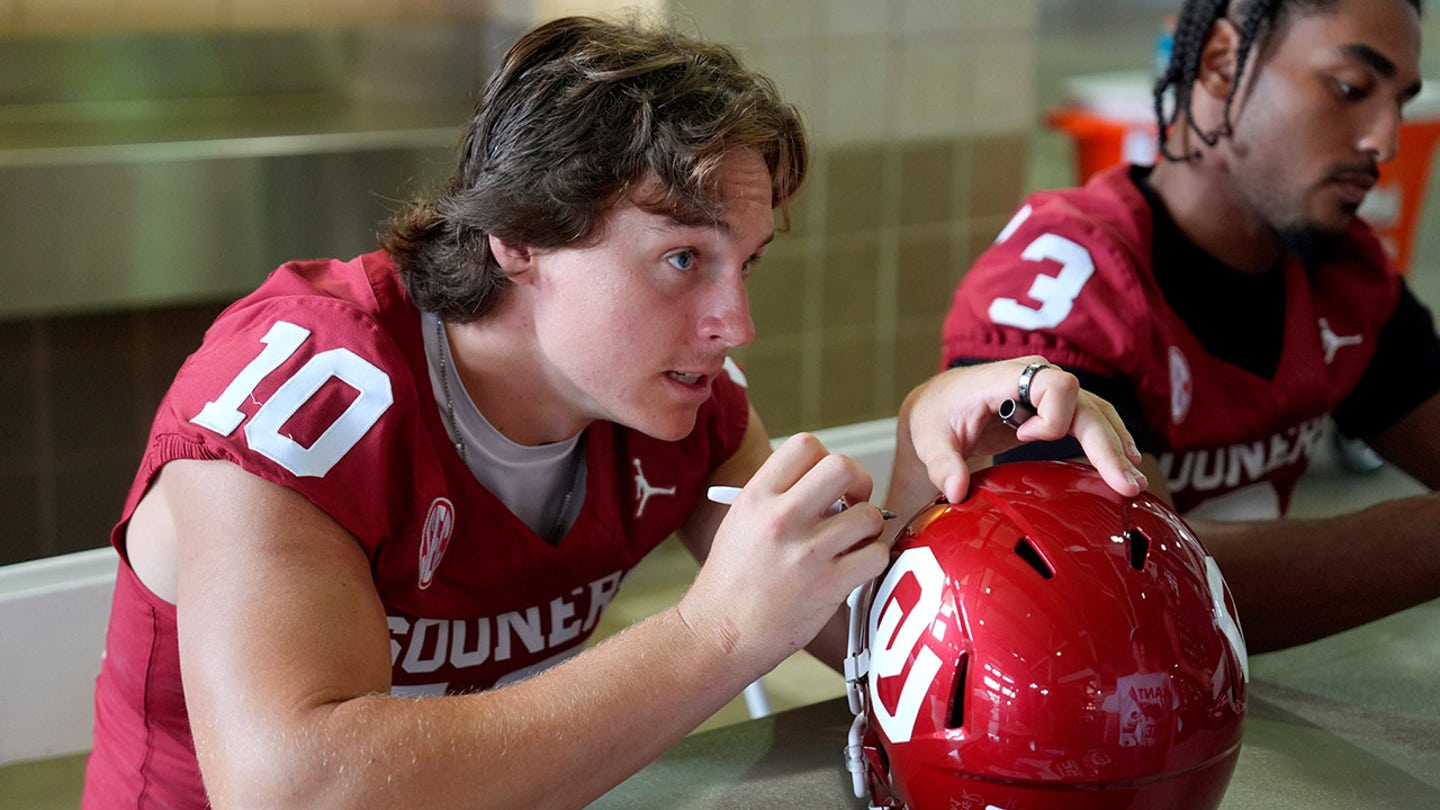 Oklahoma Soners Quarterback John Mate (10) signs a helmet for a fan under Meet the Soners Day at Gaylord Family – Oklahoma Memorial Stadium, Saturday 2 August 2025. (IMagn)