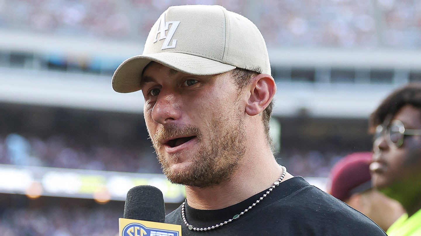 Former Texas A&M player Johnny Manziel is interviewed during the game between Agggies and Louisiana Monroe Warhawks on Kyle Field. (Troy Taormina/USA Today Sports)