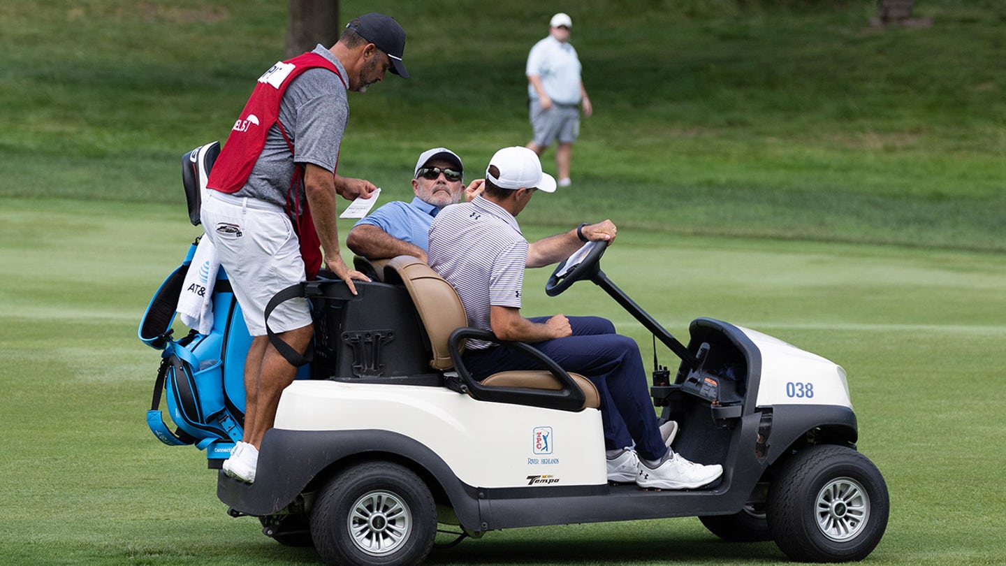 Jordan Spieth enters a golf cart after withdrawing from the tournament on the 13th hole during the first round of the Traveler’s Championship. (Bill Streicher/Imag photos)