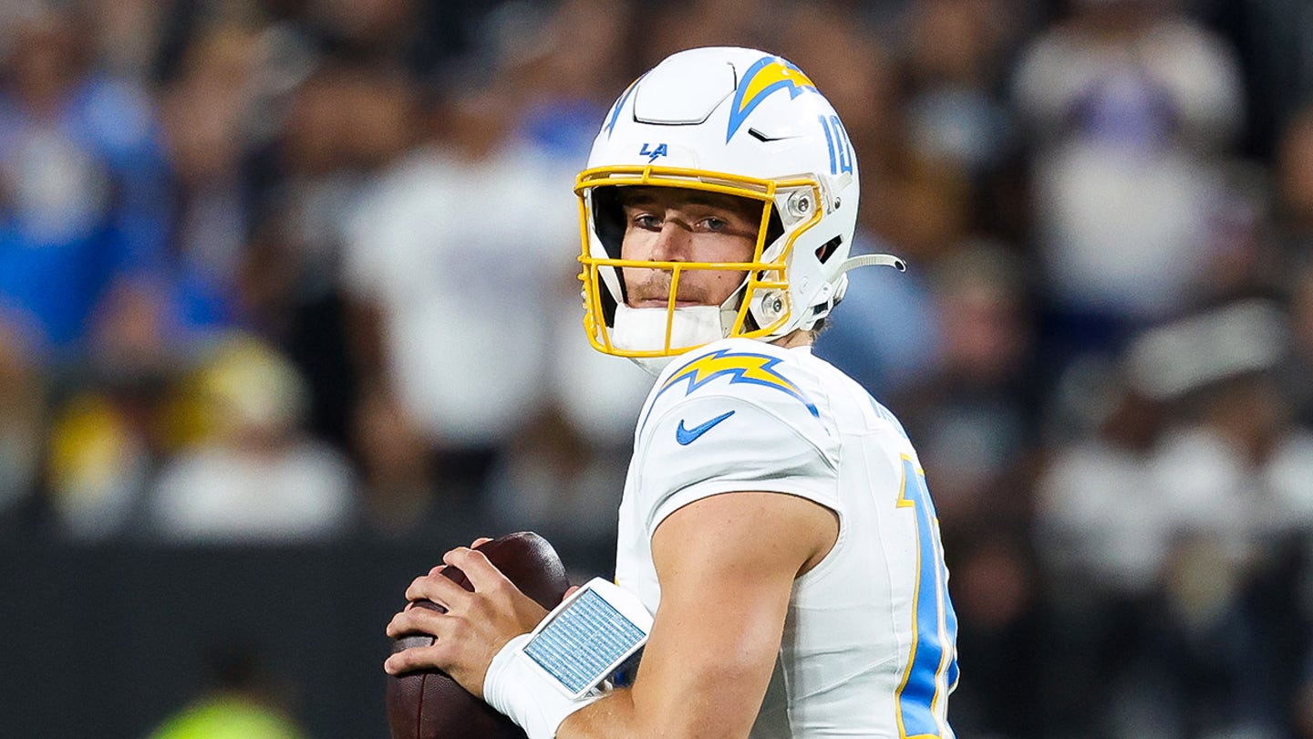 Los Angeles Chargers Quarterback Justin Herbert (10) seems to pass through the first quarter against Las Vegas Raiders at Allegiant Stadium on September 15, 2025. (Kiyoshi Mio/Imag images)